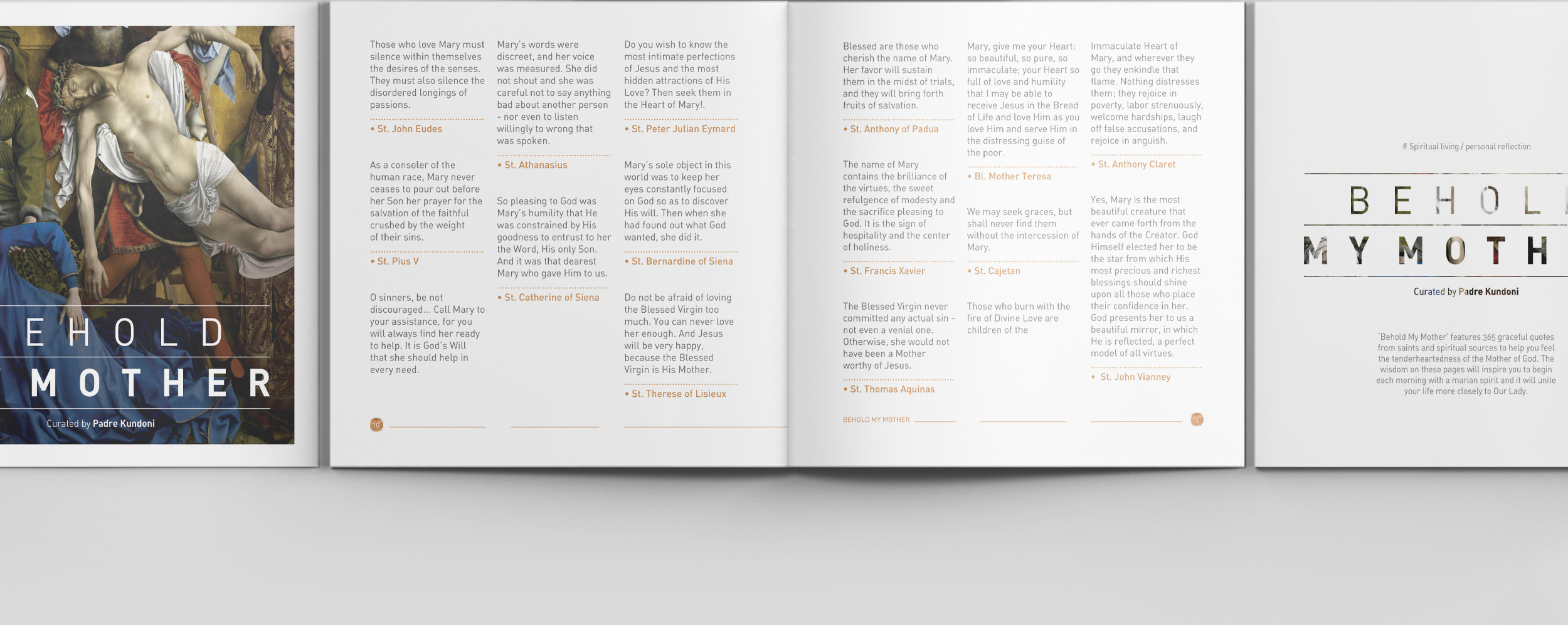 studio talk // padre kundoni approached us with his idea of releasing a spiritual book worldwide. he intended to release it in public interest rather than making it a commercial initiative. though, we never wanted to compromise the look and feel of the book and wanted it to be at par with other such international editions. the book is an elegant combination of personal reflections by holy saints and paintings by world renowned artists. finally a work of art was designed and released that blended spirituality and beauty together.